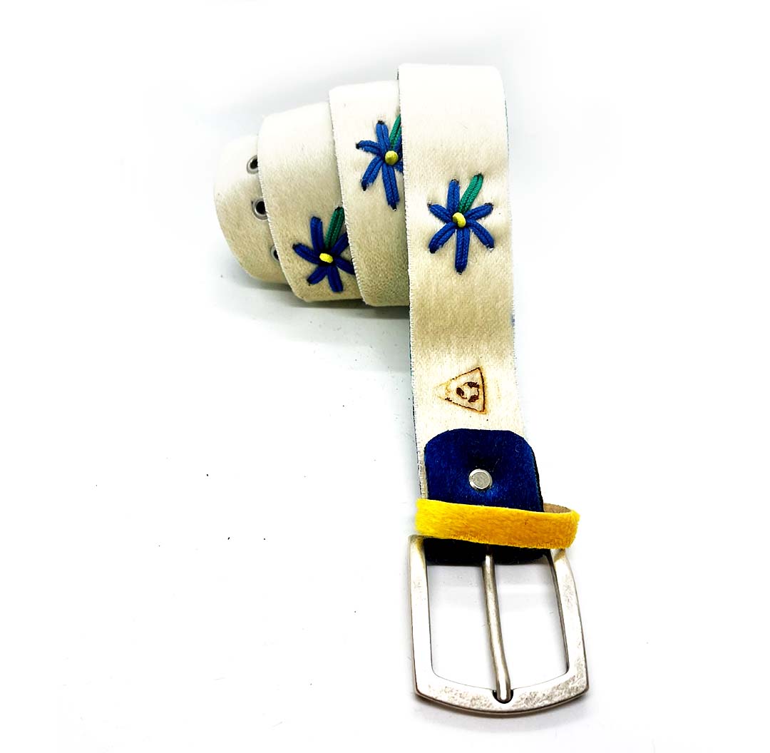 Cintura con impuntura stella alpina, pelle bianca e impuntura electric blue.
