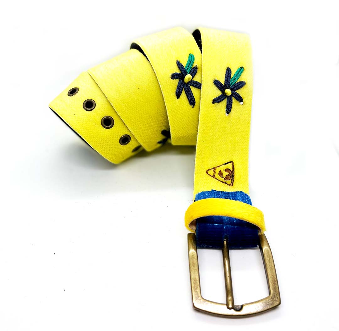 Cintura con impuntura stella alpina, pelle gialla e impuntura night blue.