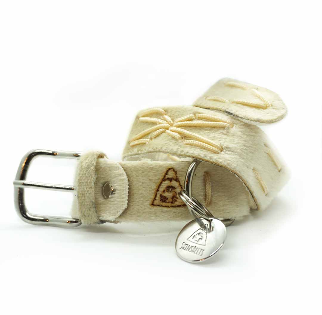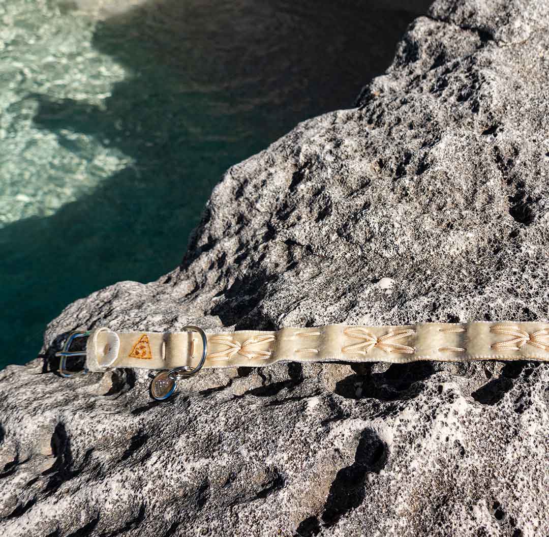 Le cinture/collari sono fatti in tessilfoca (‘’pelli di foca’’) riciclata, costituita da fibra naturale (lama mohair), fibra sintetica o miste. Tutte le pelli da noi utilizzate sono recuperate in quanto non più utilizzabili per la pratica dello sci alpinismo. Anche gli inserti delle fibbie e i passanti sono fatti con ritagli di pelli.