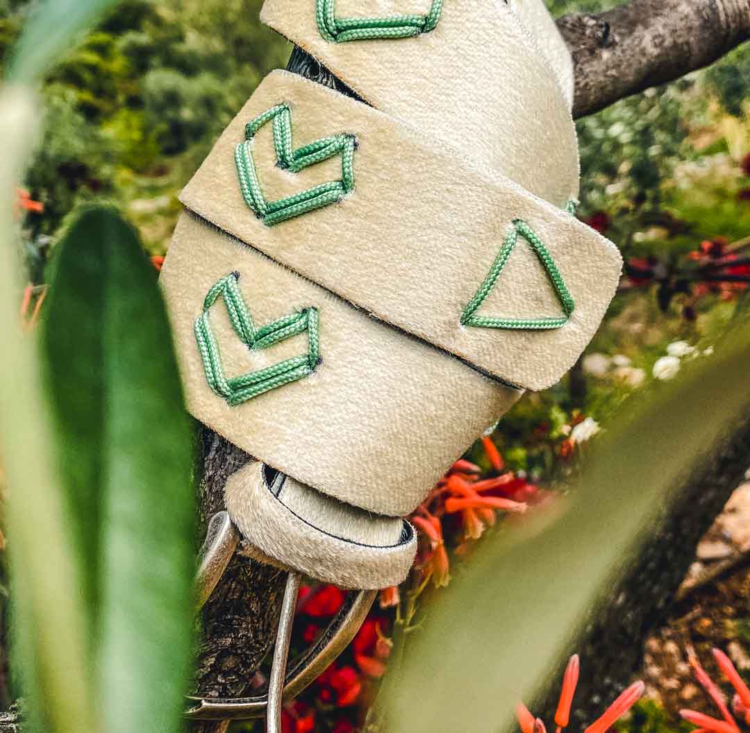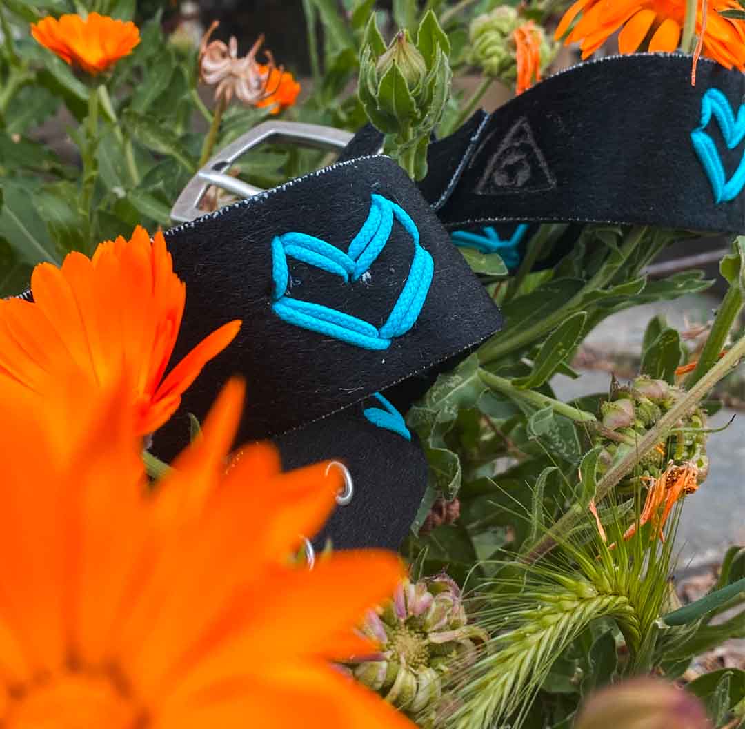 Le cinture/collari sono fatti in tessilfoca (‘’pelli di foca’’) riciclata, costituita da fibra naturale (lama mohair), fibra sintetica o miste. Tutte le pelli da noi utilizzate sono recuperate in quanto non più utilizzabili per la pratica dello sci alpinismo. Anche gli inserti delle fibbie e i passanti sono fatti con ritagli di pelli.
